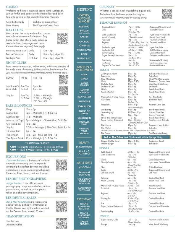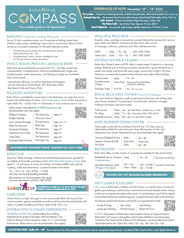Baha Mar’s weekly activity guide, Compass, provides the most up to date information for the sweeping array of activities, amenities and experiences available during your stay at the resort.